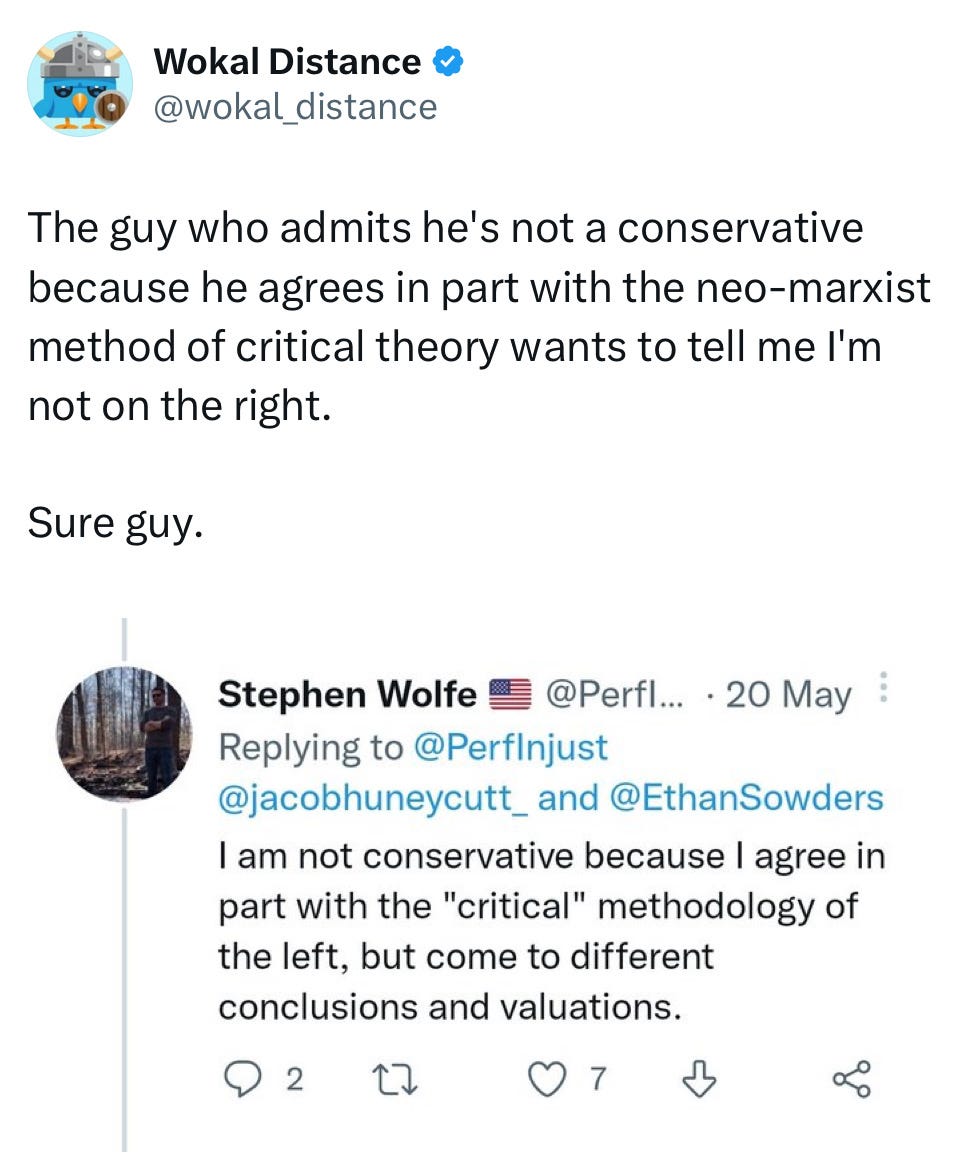 Stephen Wolfe’s The Case for Christian Nationalism presents itself as a blueprint for restoring a Christian society. But behind its lofty ideals lies a framework borrowed from the very ideologies it claims to oppose—and he admits it. Wolfe has openly embraced critical theory’s analytical tools, stating, “I will not reject a ‘critical’ approach to social phenomena. There are subtle hierarchies of power, some natural and proper, and others artificial and absurd.” He also noted in another post that he recognizes that this embrace of critical theory means he’s not a conservative.